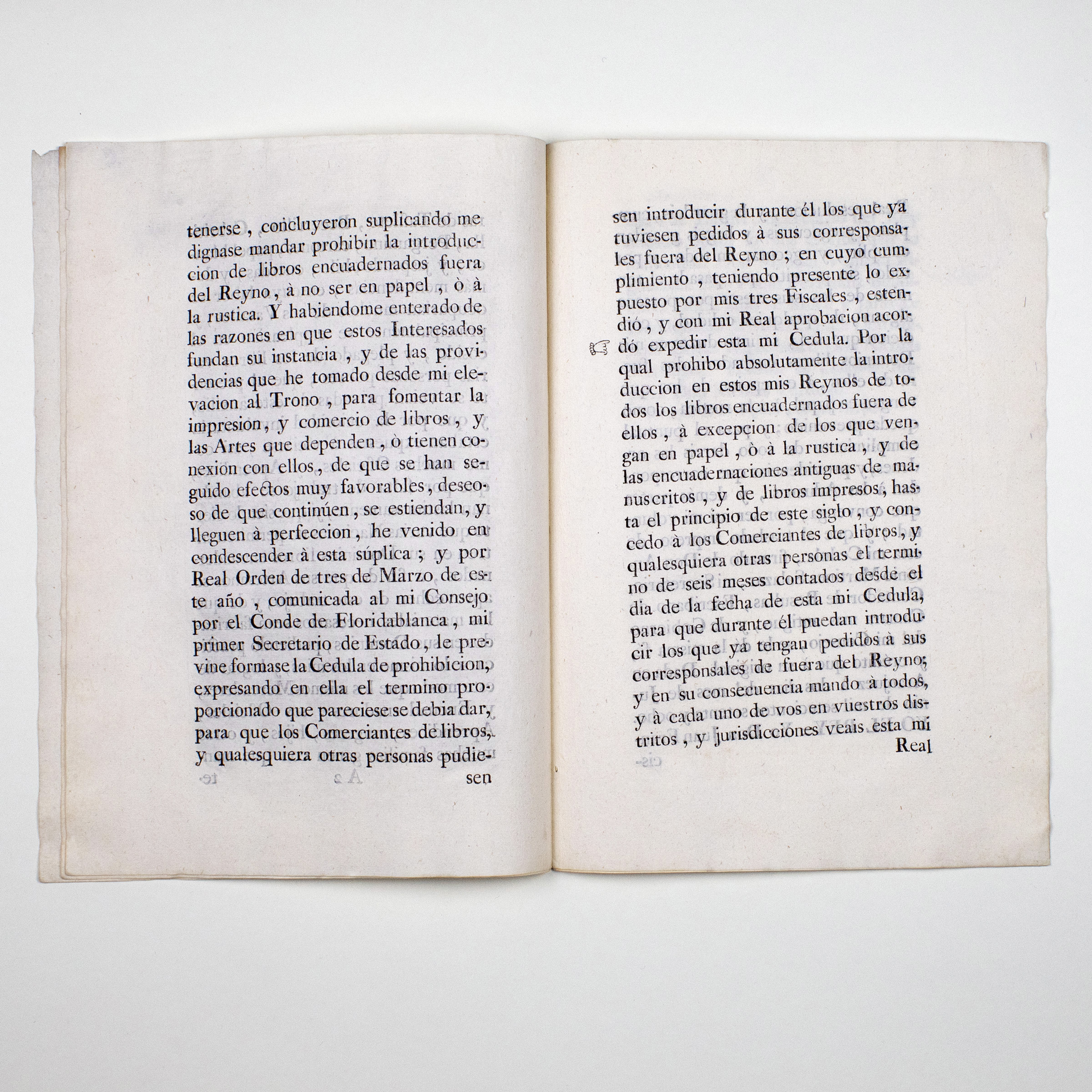 Le règne de Carlos III (1759-1788) fut marqué par une grande expansion économique, en particulier dans le domaine de la culture et des arts. Il prit de nombreuses mesures pour encourager l'activité des libraires et des métiers du livre, le protectionnisme royal atteignant des sommets avec cette ordonnance du 2 juin 1778.
